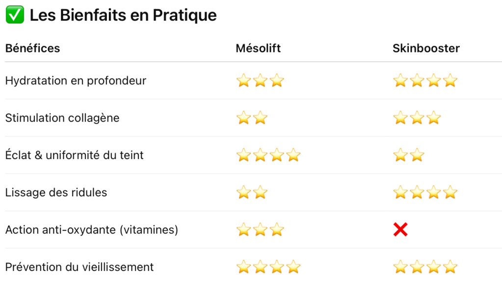 Le Skinbooster, quant à lui, est un acide hyaluronique pur, très faiblement réticulé, injecté plus profondément dans le derme pour restaurer l’hydratation, améliorer la fermeté et lisser les ridules.Contrairement au mésolift classique, les skinboosters ne contiennent pas de complexes vitaminés : leur pouvoir repulpant et hydratant repose uniquement sur la haute concentration en acide hyaluronique. On parle souvent de soin hydratant injectable de fond.
